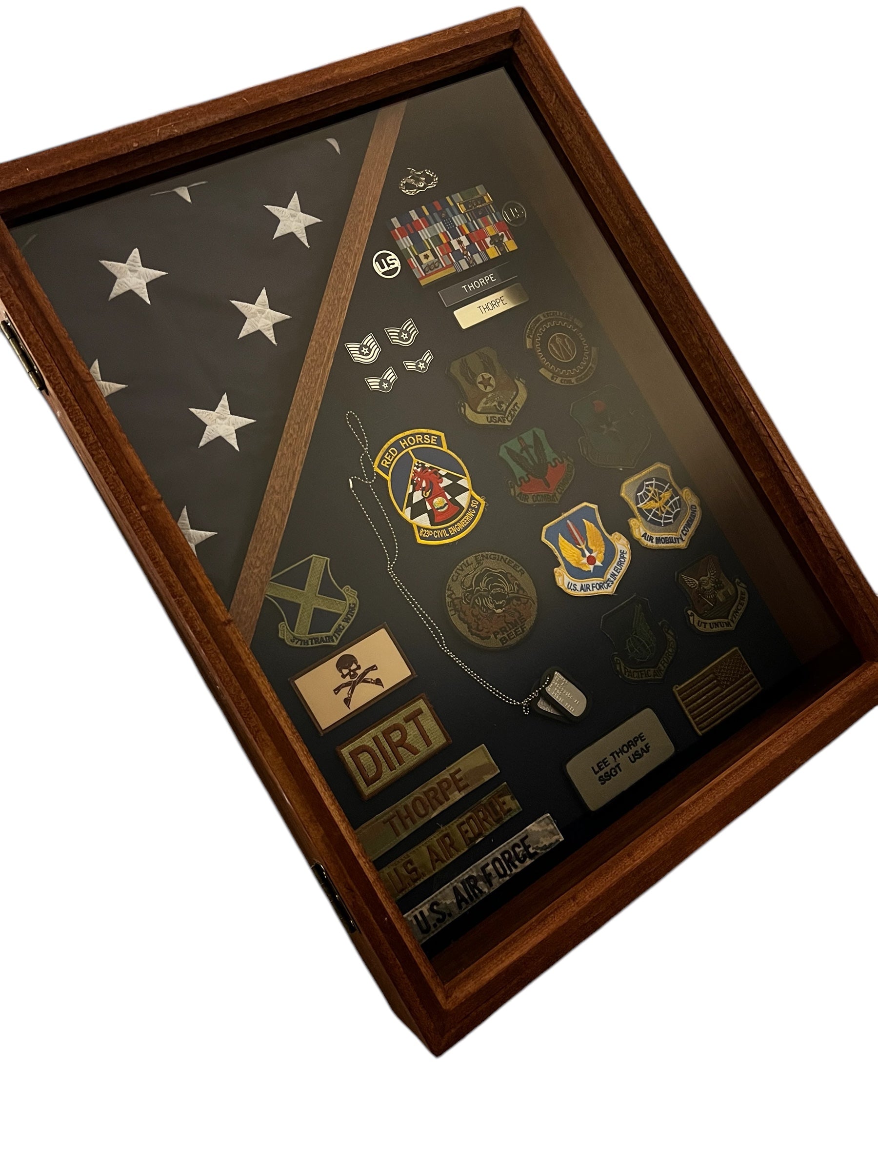 Display your military pride and honor with our Military Shadow Box. Perfectly sized for any flag, this shadow box is a beautiful way to showcase and protect your most treasured memories. A must-have for any military enthusiast. Own yours today! Please note that the flag is not provided with the box.