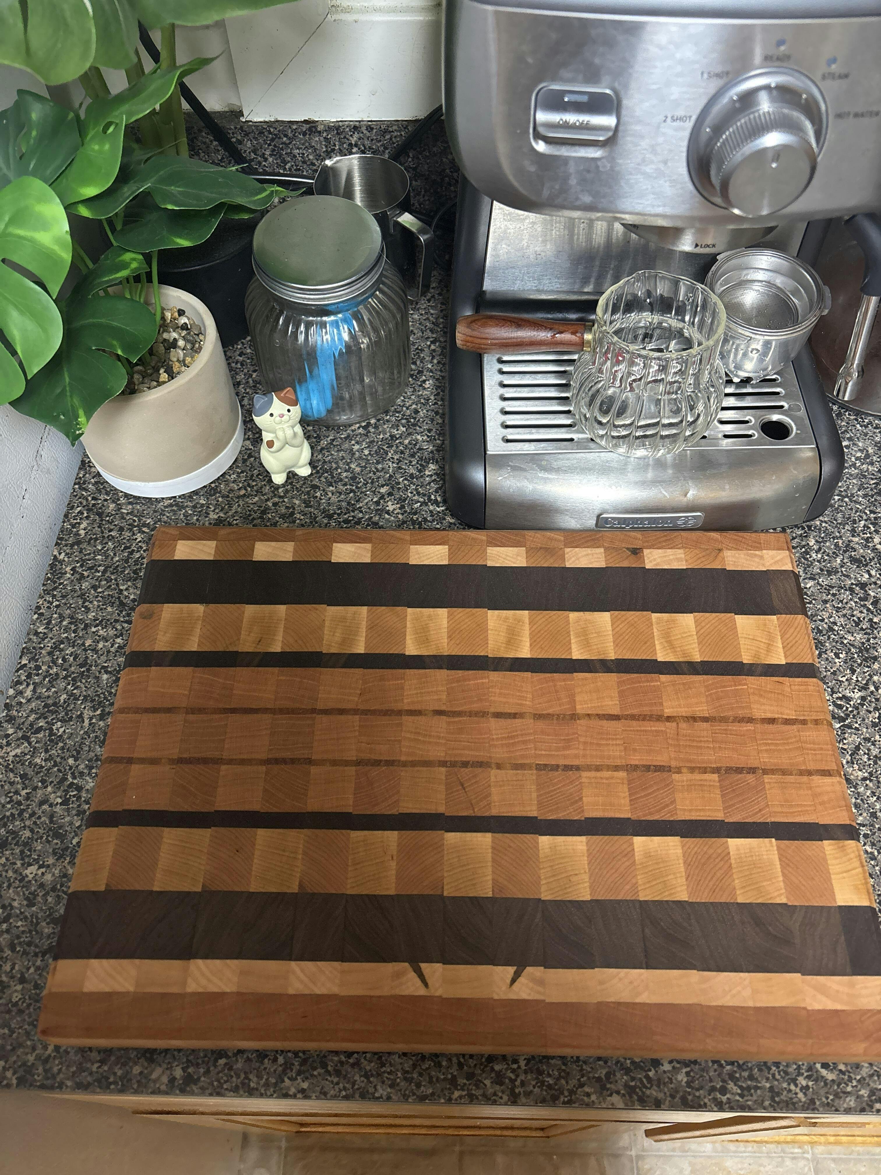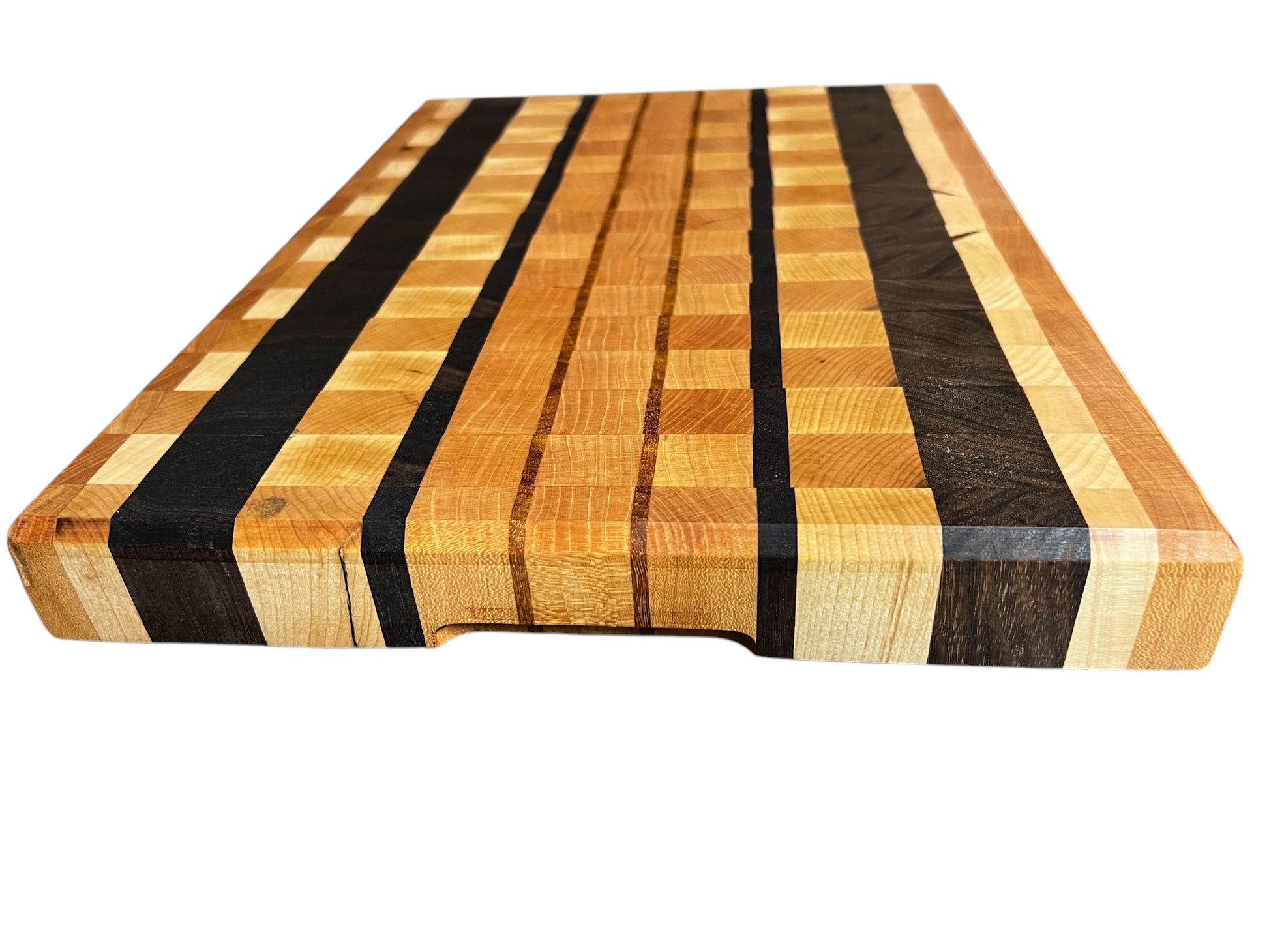 Indulge in the ultimate cutting experience with our Striped Artisan End Grain Cutting Board! Crafted from high-quality walnut, cherry, and maple, the end grain design provides durability and a unique striped pattern. Measuring at 16" x 12", this cutting board is perfect for all your culinary needs. Note: Design will vary slightly between sizes due to proportion constraints.